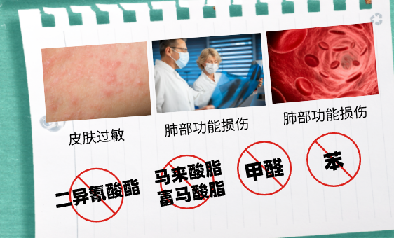 二異氰酸酯會刺激感受體、破壞細胞,造成皮膚及黏膜的損傷、肺部功能損傷、肝功能損傷、造血功能損傷等危害。如果皮膚直接接觸二異氰酸酯,會對皮膚和黏膜造成損害。可能會出現皮膚刺痛、瘙癢甚至出現過敏反應的情況。