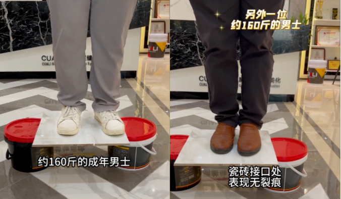 將醇和聚脲均勻涂抹在2塊瓷磚縫隙上,并將瓷磚粘結,等待縫隙24小時固化后,用力踩壓瓷磚,瓷磚也沒有斷裂。