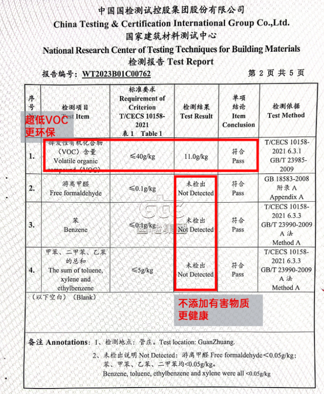 磚麗醇和聚脲美縫劑不含壬基酚、甲醛、苯等有害物質,揮發性有機化合物(VOC)檢測結果優于標準限值近2倍。磚麗產品通過世界嚴苛環保標準的法國A+認證和德國EC1認證,為您和家人的健康提供環保保障,帶來綠色的家居環境。