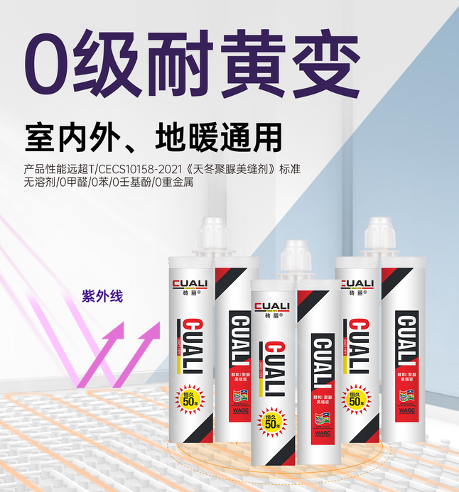 聚脲美縫劑則采用了天冬聚脲作為主要基材,并且不含有變色基團。因此,在紫外線照射下,聚脲美縫劑不會發生變色發黃的現象。經過測試,在紫外線加速耐候試驗機連續照射7天之后,磚麗醇和純聚脲美縫劑也沒有發生變色,達到了0級的耐黃變要求。
