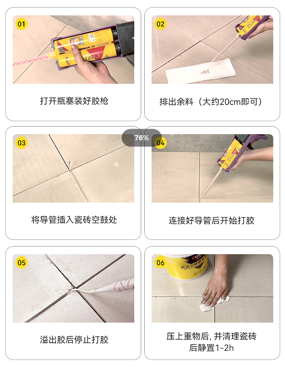 磚麗雙管空鼓膠的使用方法非常簡單,只需幾個步驟即可完成修復。首先,打開瓶塞裝好膠槍,然后排出一定長度的余料。接著,將導管插入瓷磚空鼓處,連接好導管后開始輕輕地擠壓膠槍,使空鼓膠填充到瓷磚空鼓處。當膠水溢出時,停止擠壓膠槍,清理多余的空鼓膠,并壓上重物。最后,靜置1-2小時,待空鼓膠完全固化后,修復工作就完成了。