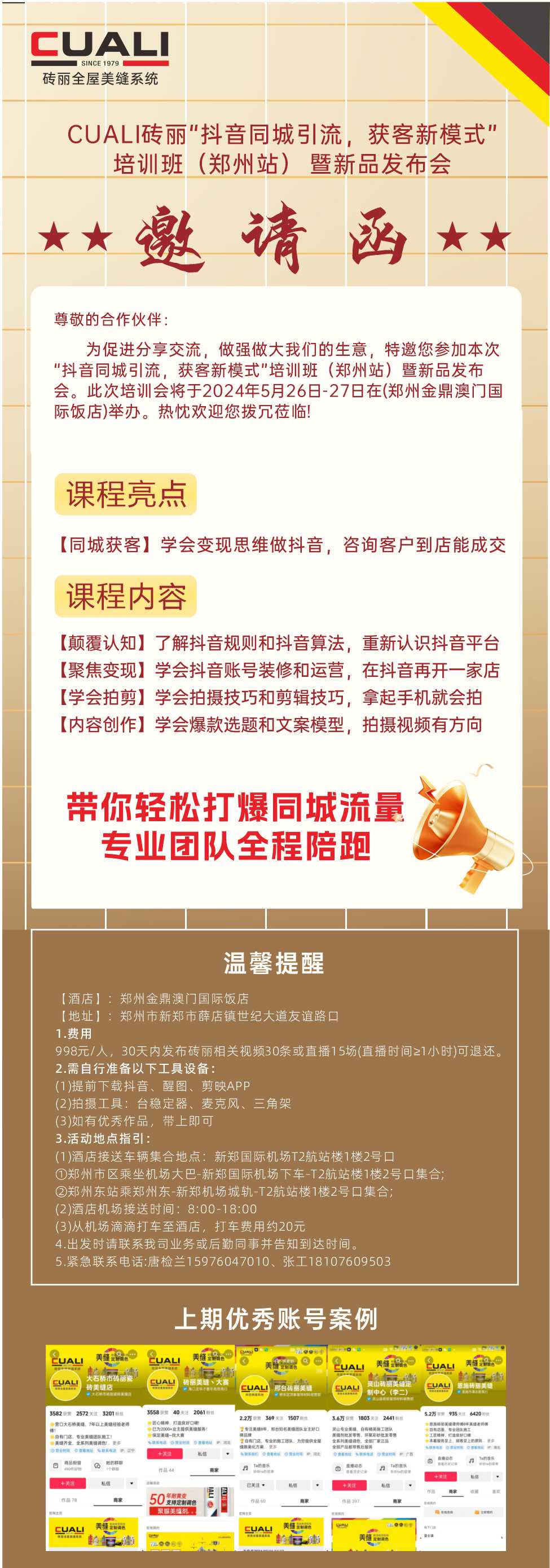 2024年CUALI磚麗“抖音同城引流,獲客新模式”培訓班 暨新品發(fā)布會 鄭州站即將開始