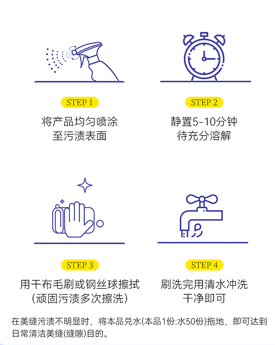 方法2:將本品兌水(本品1份:水50份)拖地,即可達到清潔美縫(縫隙)目的。